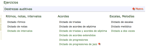 Hoy os presento una web muy interesante para trabajar aspectos relacionados con el Lenguaje Musical, Teoría.com. En ella podréis encontrar cuestiones teóricas y también gran cantidad de ejercicios musicales. En el apartado Ejercicios hay que destacar la parte referida a Destrezas Auditivas, donde aparecen ejercicios auditivos divididos en tres bloques (Ritmos, notas, intervalos – Acordes – Escalas, Melodías).