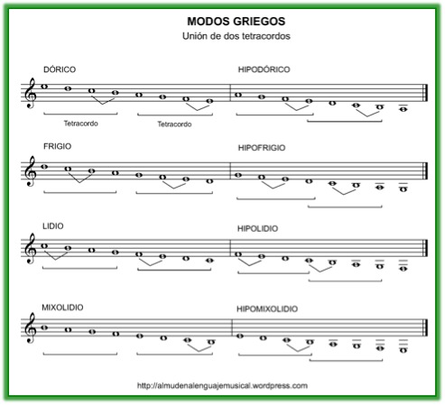 MODOS GRIEGOS: la antigua teoría musical griega se basaba en el tetracordo (sucesión conjunta de cuatro notas en sentido descendente, comprendidas en el ámbito de una 4ª justa, que se diferenciaban por la distinta colocación del semitono o la ausencia de él, como ocurre en el tetracordo mixolidio). La unión de dos tetracordos se denominaba modo (especie de escala musical), surgiendo de esta forma 4 modos: dórico (comienzo en MI), frigio (comienzo en RE), lidio (comienzo en DO) y mixolidio (comienzo en SI). Los tres primeros modos son simétricos (dos tetracordos iguales por la colocación del semitono), mientras que el último modo (mixolidio) es asimétrico (el primer tetracordo no tiene semitono, el segundo sí). Cada modo tenía su correspondiente HIPO, que se obtenía pasando el tetracordo agudo al grave, es decir, invirtiendo su disposición, y se añadía una nota grave para completar la octava.
