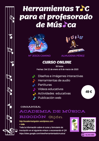 Hoy os presento el curso online «Herramientas TIC para el profesorado de Música», organizado por la Academia de Música Rigodón (Gijón), que voy a impartir junto a María Jesús Camino, con la que siempre es un placer trabajar y de la que sigo aprendiendo cada día.