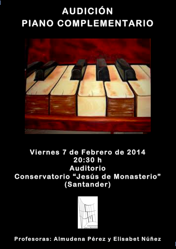 Este Viernes, 7 de Febrero, a las 20:30 h, celebraremos la Audición de Piano Complementario, en el Auditorio del Conservatorio Profesional de Música «Jesús de Monasterio» (Santander). Los/as alumnos/as han trabajado mucho y os esperamos a todos y a todas. Deseamos que disfrutéis del concierto, en el que se interpretarán obras del repertorio clásico para piano y también obras más modernas.